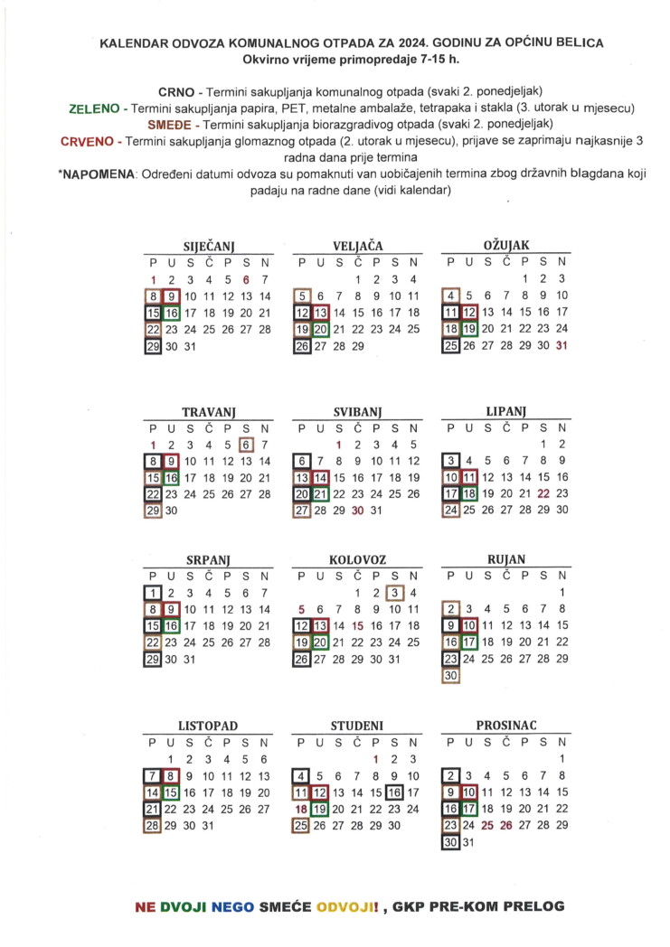 KALENDAR ODVOZA OTPADA U 2024. GODINI
