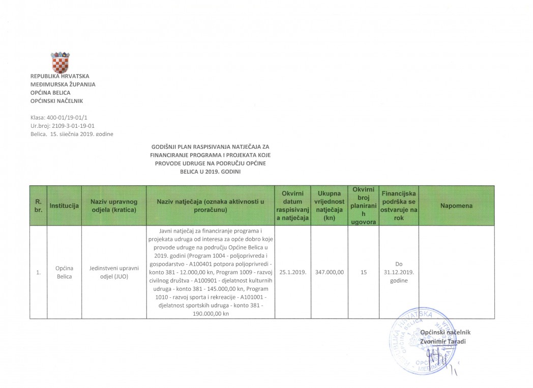 Godišnji plan raspisivanja natječaja za financiranje programa i projekata koje provode udruge na području Općine Belica u 2019. godini