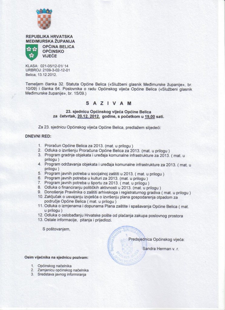 U četvrtak, 20.12.2012. godine, u 19,00 sati održat će se 23. sjednica Općinskog vijeća.