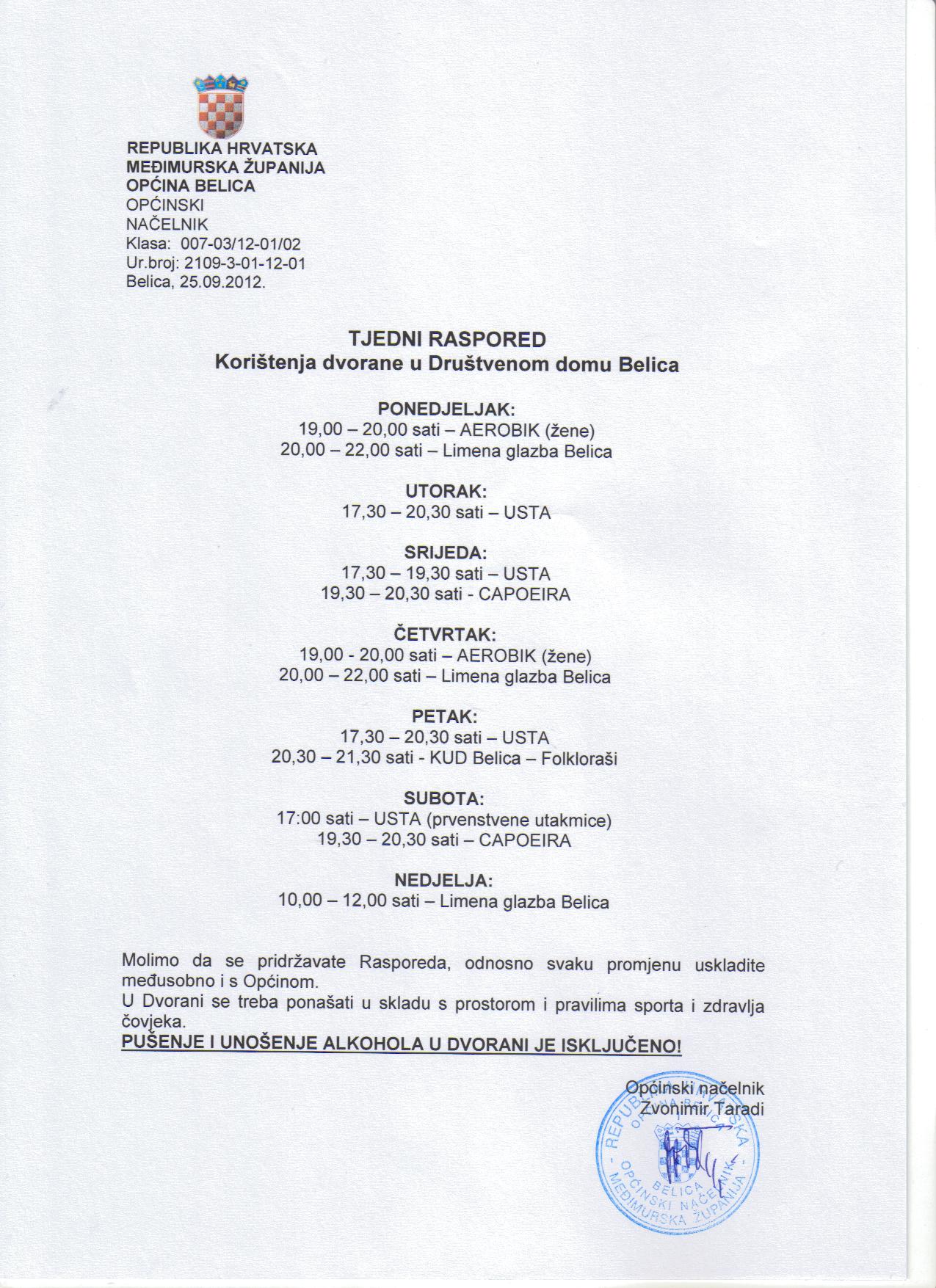 Tjedni raspored korištenja dvorane u Društvenom domu Belica